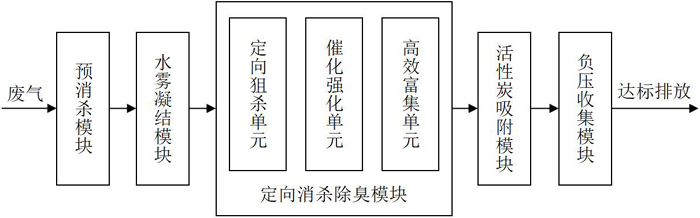 ④ 病毒富集、定向消殺、除臭過程:除濕后的廢氣進(jìn)入定向消殺除臭模塊,病毒被定向狙擊消殺,惡臭被分解消除。具體地:
